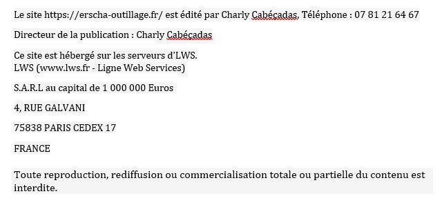 L’ensemble des éléments figurant sur http://www.erscha-outillage.fr sont protégés par les dispositions du Code de la Propriété Intellectuelle. En conséquence, toute reproduction de ceux-ci, totale ou partielle, ou imitation, sans notre accord exprès, préalable et écrit, est interdite.